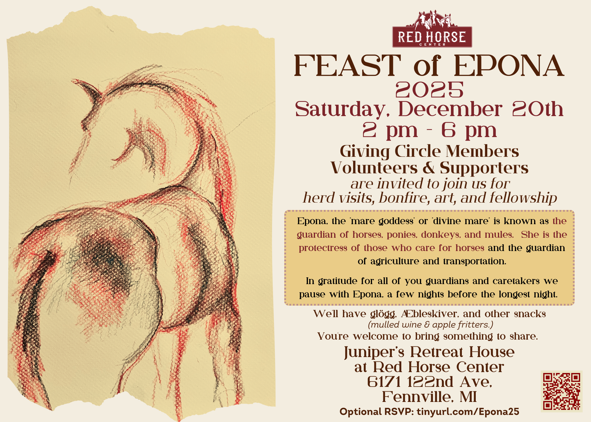Feast of Epona is our annual gathering of Red Horse Giving Circle supporters, including volunteers, donors, and sponsors. It's a potluck with Danish Glögg, Æbleskiver, and camaraderie. We look forward to connecting with many of you there!