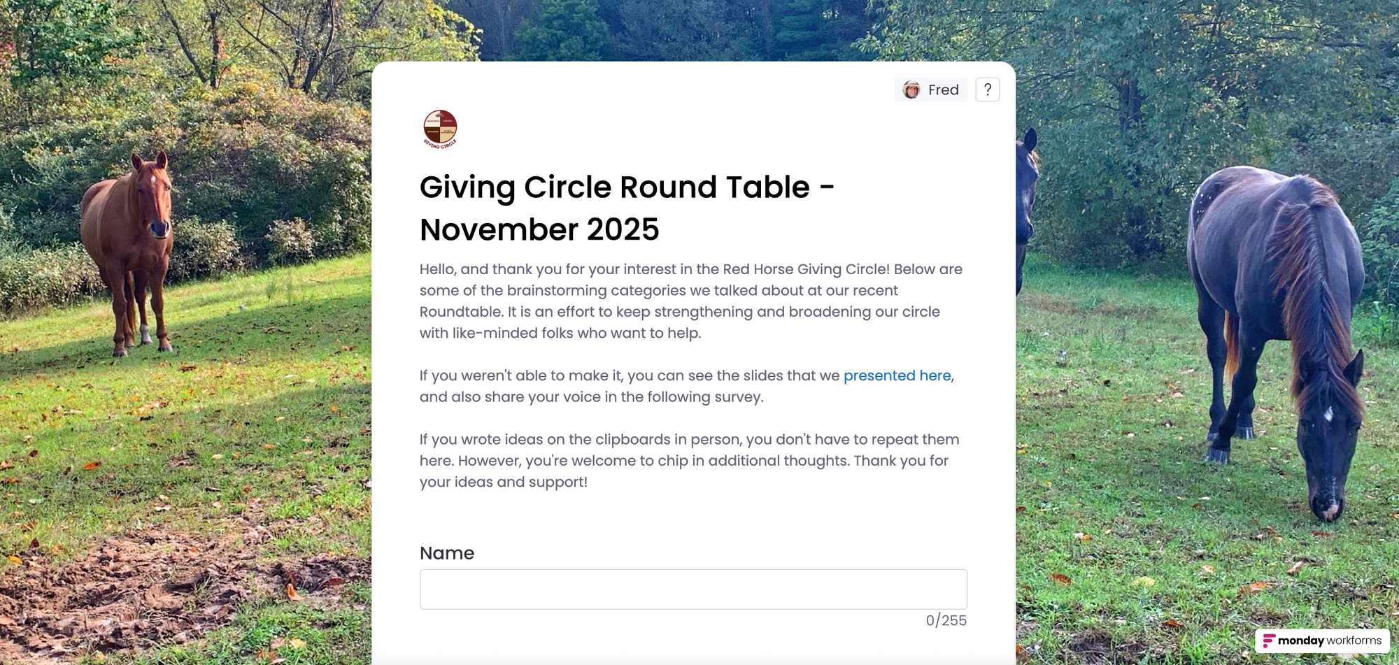 We are still wrapping things up from the Fall Support Drive, but we want to share our thanks for engagement and listening. We saw many of you at Farm Days, Allyship Series events, First Fridays, and in Rountable conversations, in-person and online. We received donations, in-kind services, and new invitations to connect with employer matches. We also raised $2,000 in the Artful Auction, all the while onboarding several new folx to the Red Horse human herd. (Update below!). All told, our fundraising efforts raised over $25,000 in support, and we couldn't be more grateful!