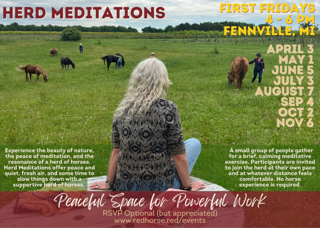 We've been busy getting our events together for Spring and are excited to announce several dates, including our Porch Party Fundraiser, Herd Meditations & other wellness events, volunteering opportunities, and Horse and Human Collaboration workshops.